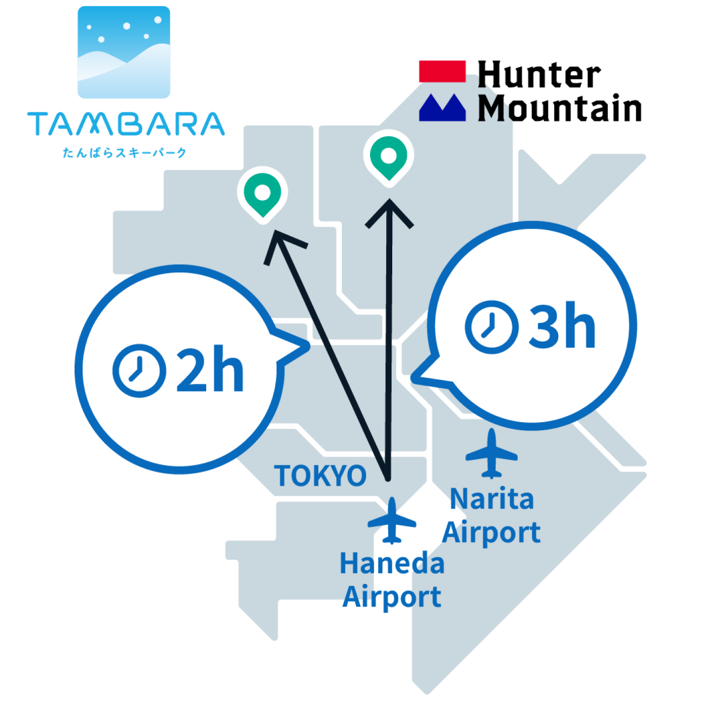 Enjoy snowy scenery and fun activities at Hunter Mountain Shiobara and Tambara Ski Park!