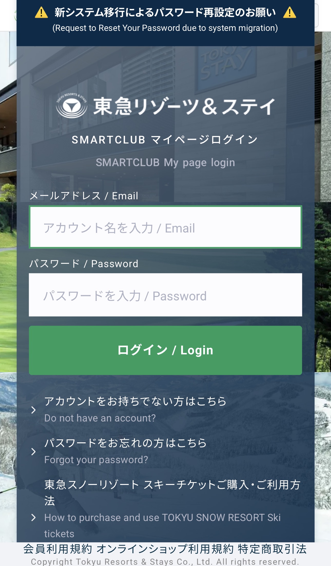 リフトチケット購入・レンタル申込・スクール予約ご利用の際にはスマートクラブへのアカウントログインが必要となります。